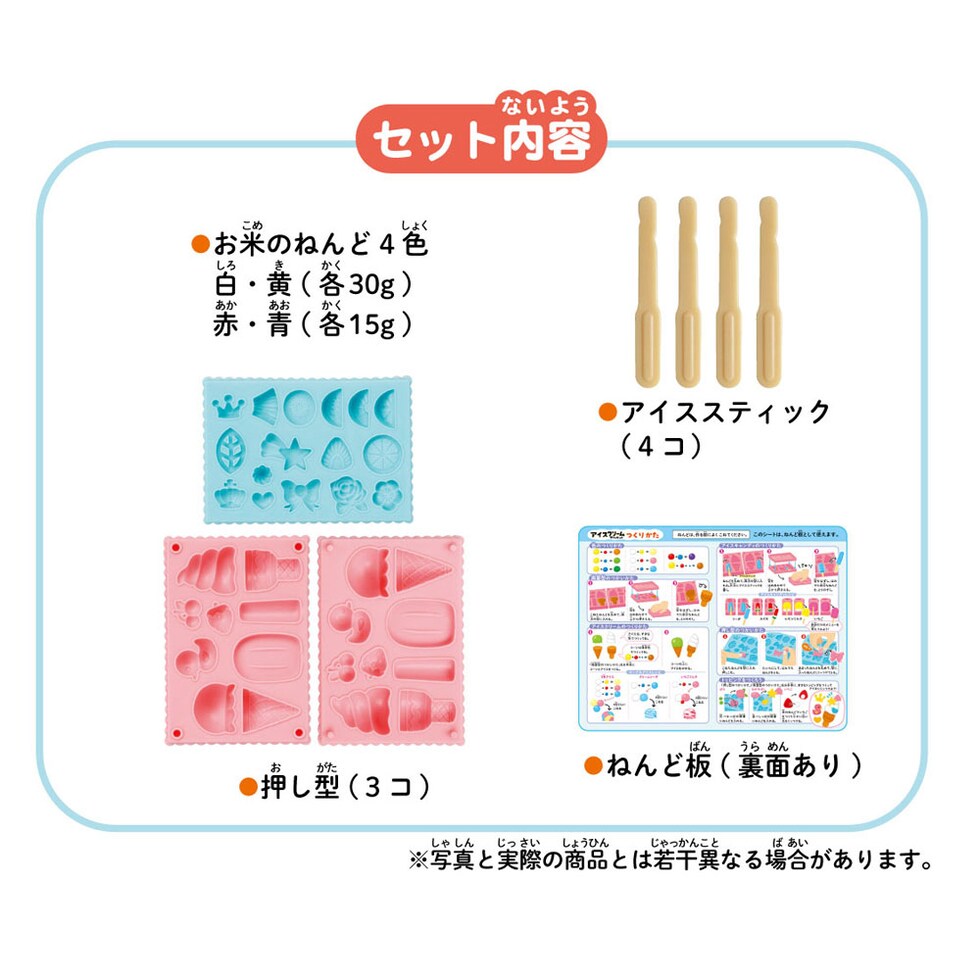 | お米のねんど 4色 (白30g、黄30g、 赤15g、青15g)、押し型3コ、アイススティック4コ、ねんど板(両面) |