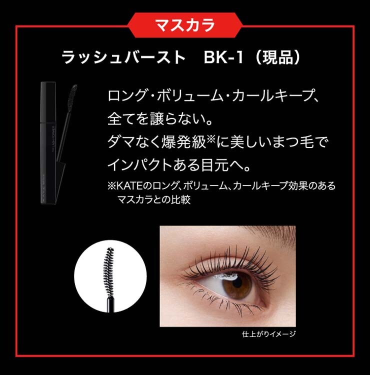 ※1 KATEのロング、ボリューム、カールキープ効果のあるマスカラとの比較。メイクアップ効果。