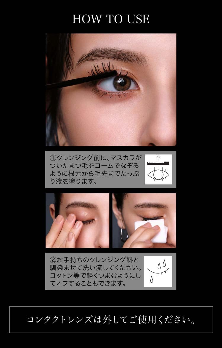 (1)クレンジング前に、マスカラがついたまつ毛をコームでなぞるように根元から毛先までたっぷり液を塗ります。