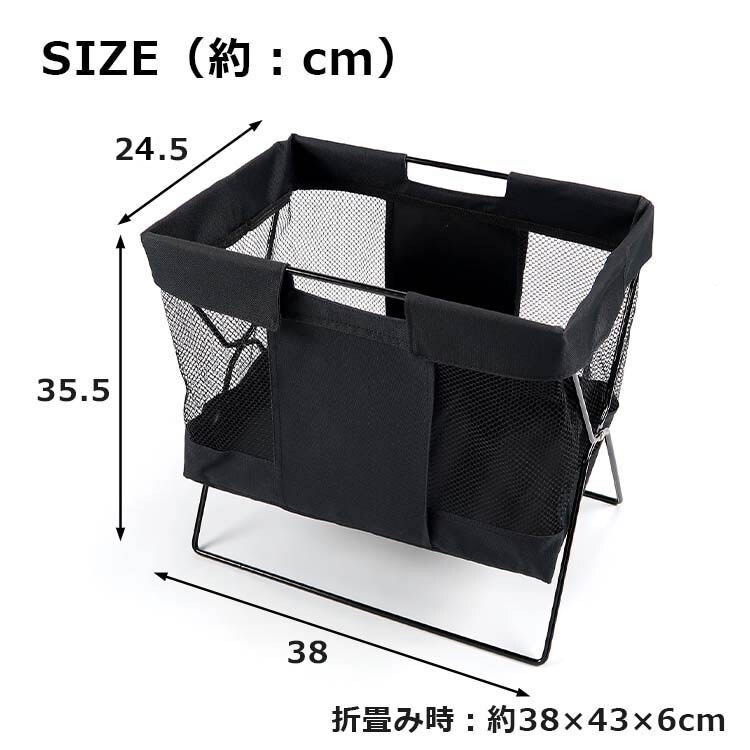 | 本体サイズ(cm):約38×35.5×24.5cm(使用時)、(折畳み時)約38×43×6cm 本体重量(g):約1090g 素材・材質:ポリエステル、ポリエステルメッシュ、スチール 原産国:中国 耐荷重:約10kg |
