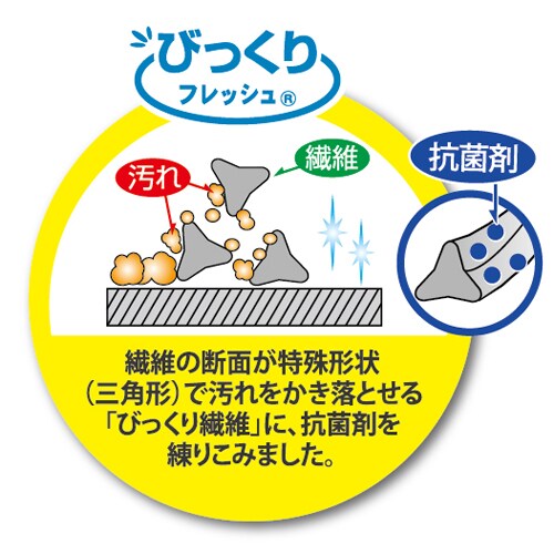 ●繊維の持つ異形断面形状の側面エッジングにより、水だけで湯アカを落とすことができる環境にやさしい商品です。