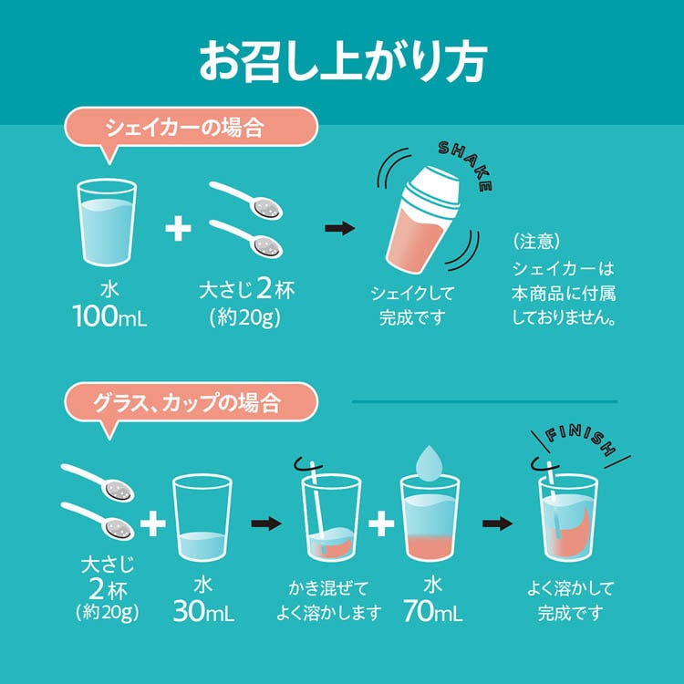 シェイカーの場合:水100ml + 大さじ2杯(約20g) → シェイクして完成です (注意)シェイカーは本商品に付属しておりません。