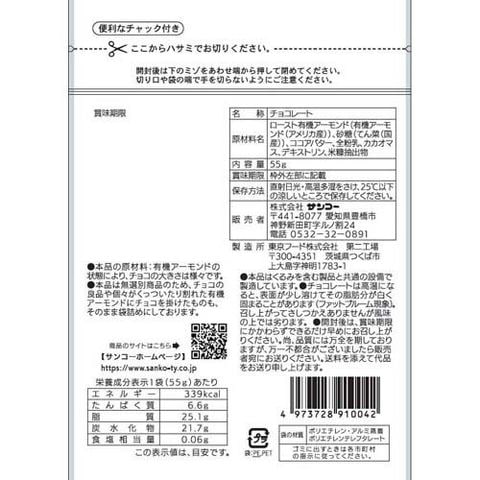 | ロースト有機アーモンド(有機アーモンド(アメリカ産))、砂糖(てん菜(国産))、ココアバター、全粉乳、カカオマス、デキストリン、米糠抽出物 |