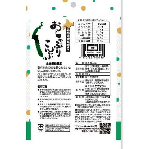 | 1袋(22g)当たり 熱量:52kcal、たんぱく質:3.0g、脂質:1.2g、炭水化物:11.6g、食塩相当量:2.8g |