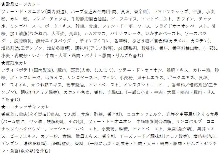 | ★チーズカレー:小麦、乳、牛肉、大豆、鶏肉、豚肉、りんご ★ビーフマサラカレー:小麦、乳、カシューナッツ、牛肉、ごま、大豆、鶏肉、豚肉、りんご ★和風ビーフカレー:小麦、乳、牛肉、大豆、鶏肉、豚肉、りんご ★欧風ビーフカレー:小麦、乳、いか、牛肉、大豆、鶏肉、バナナ、豚肉、りんご ★復刻版カレー:小麦、牛肉、大豆、鶏肉、豚肉、りんご ★ココナッツチキンカレー:小麦、乳、牛肉、大豆、鶏肉、豚肉、りんご、ゼラチン、魚介類 |