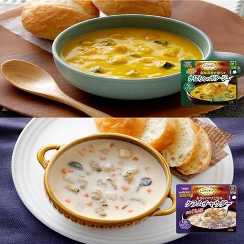 | 各2袋 ・レンジでおいしい コーンのポタージュ ・レンジでおいしい クラムチャウダー ・レンジでおいしい 野菜と豆ともち麦のミネストローネ ・レンジでおいしい かぼちゃのポタージュ |
