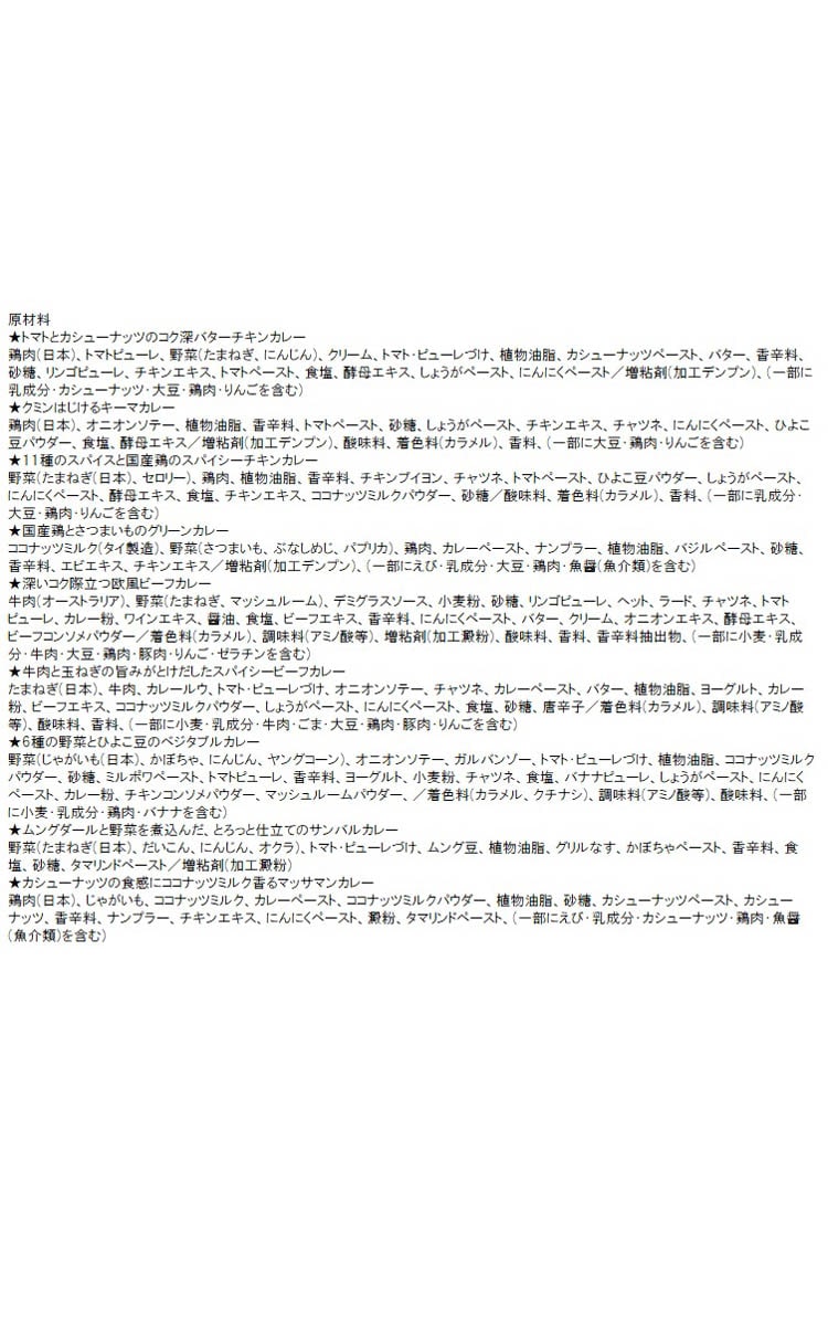 | ★トマトとカシューナッツのコク深バターチキンカレー:一部に乳成分・カシューナッツ・大豆・鶏肉・りんごを含む ★クミンはじけるキーマカレー:一部に大豆・鶏肉・りんごを含む ★11種のスパイスと国産鶏のスパイシーチキンカレー:一部に乳成分・大豆・鶏肉・りんごを含む ★国産鶏とさつまいものグリーンカレー:一部にえび・乳成分・大豆・鶏肉・魚醤(魚介類)を含む ★深いコク際立つ欧風ビーフカレー:一部に小麦・乳成分・牛肉・大豆・鶏肉・豚肉・りんご・ゼラチンを含む ★牛肉と玉ねぎの旨みがとけだしたスパイシービーフカレー:一部に小麦・乳成分・牛肉・ごま・大豆・鶏肉・豚肉・りんごを含む ★6種の野菜とひよこ豆のベジタブルカレー:一部に小麦・乳成分・鶏肉・バナナを含む ★ムングダールと野菜を煮込んだ、とろっと仕立てのサンバルカレー:なし ★カシューナッツの食感にココナッツミルク香るマッサマンカレー:一部にえび・乳成分・カシューナッツ・鶏肉・魚醤魚介類を含む |