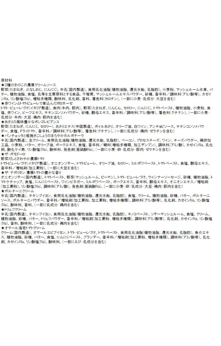 | ★3種のきのこの濃厚クリームソース:一部に小麦・乳成分・大豆を含む ★赤ワインとトマトピューレで煮込んだボロネーゼ:一部に小麦・乳成分・牛肉・大豆・鶏肉・豚肉を含む ★あさりの風味豊かなボンゴレビアンコ:一部に乳成分・鶏肉・ゼラチンを含む ★パンチェッタと粗挽きこしょうのまろやかカルボナーラ:一部に小麦・卵・乳成分・豚肉・ゼラチンを含む ★ザ・ポモドーロ:野菜だしとさわやか濃厚トマト:一部に大豆を含む ★ザ・ナポリタン 濃厚トマトの豊かな香り:一部に小麦・卵・乳成分・大豆・鶏肉・豚肉を含む ★ポルチーニクリーム:一部に乳成分・鶏肉を含む ★トリュフクリーム:一部に乳成分・鶏肉を含む ★オマール海老トマトクリーム:一部にえび・乳成分を含む |