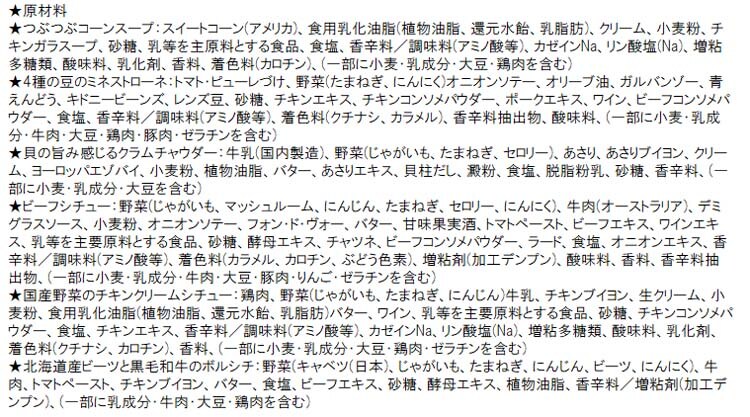 | ★つぶつぶコーンスープ:小麦・乳成分・大豆・鶏肉 ★4種の豆のミネストローネ:小麦・乳成分・牛肉・大豆・鶏肉・豚肉・ゼラチン ★貝の旨み感じるクラムチャウダー:小麦・乳成分・大豆 ★ビーフシチュー:小麦・乳成分・牛肉・大豆・豚肉・りんご・ゼラチン ★国産野菜のチキンクリームシチュー:小麦・乳成分・大豆・鶏肉・ゼラチン ★北海道産ビーツと黒毛和牛のボルシチ:乳成分・牛肉・大豆・鶏肉 |