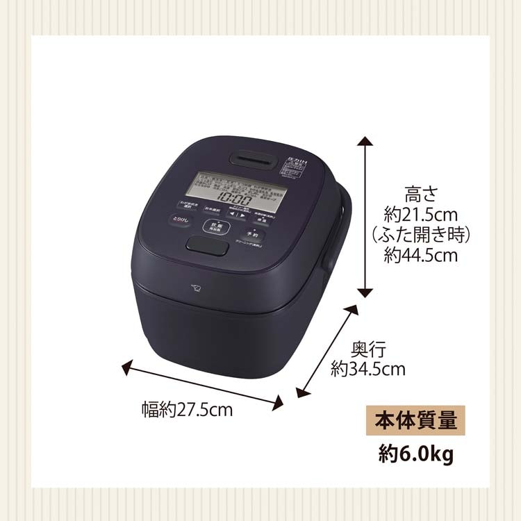 | 本体寸法(幅×奥行×高さ)27.5×34.5×21.5cm、本体質量:6kg、個装箱寸法(幅×奥行×高さ)31.5×40×28cm、個装箱質量:7kg、生産国:日本、消費電力:1240W、電源コード:コードリール式1m、炊飯容量(白米)(L):0.09~1.0、カラー: ブラック |