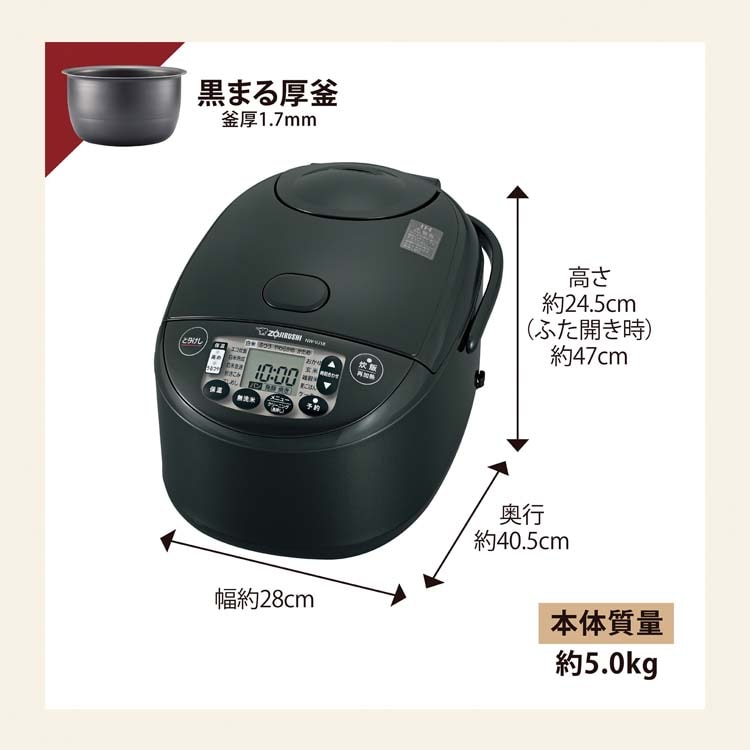 本体寸法(幅×奥行×高さ)28×40.5×24.5cm、本体質量:5kg、個装箱寸法(幅×奥行×高さ)32.5×45.5×28cm、個装箱質量5.5kg、生産国:日本、消費電力:1295W、電源コード:コードリール式1m、炊飯容量(白米)(L):0.18~1.8、カラー: ブラック