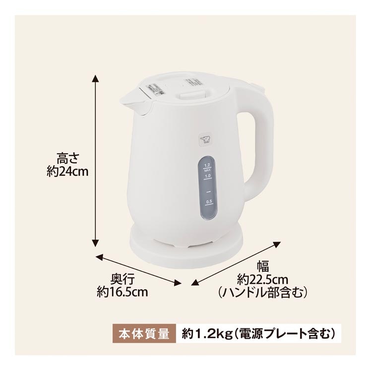 | 本体寸法(幅×奥行×高さ)22.5×16.5×24cm 本体質量:1.2kg 個装箱寸法(幅×奥行×高さ)23×21×24.5cm 個装箱質量:9.5kg 生産国:中国 消費電力:1300W 電源コード:1.3m 容量(L):1.2L 湯沸かし時間(満水時):約6分(1200ml) カラー: ホワイト |