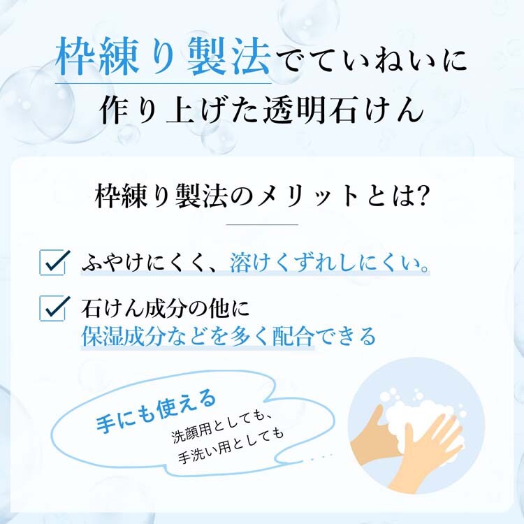 ●(ていねいにつくられた枠練り石けん)時間をかけて熟成させる「枠練り製法」を採用し、ていねいにつくり上げた透明石けんです。