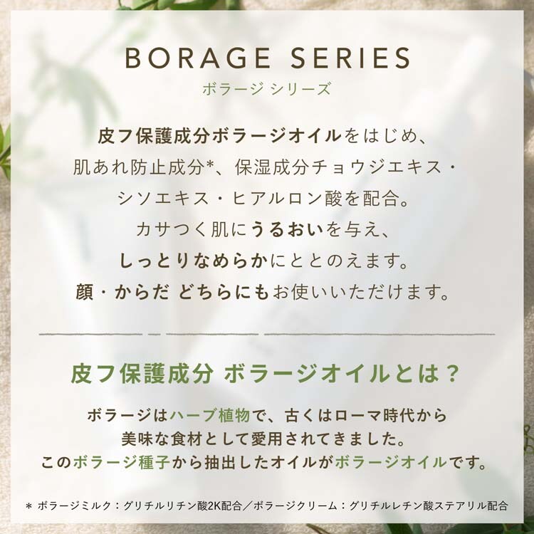 | (有効成分) 肌あれ防止成分:グリチルリチン酸2K 0.10% (その他の成分) 油性エモリエント成分:流動パラフィン 8.00%、セタノール 1.00%、サラシミツロウ 1.00%、ワセリン 1.00%、スクワラン 0.50%、エチルヘキサン酸セチル 0.50% 保湿成分:濃グリセリン 5.00%、BG 3.05%、ヒアルロン酸ナトリウム(2) 0.03%、シソエキス(1) 適量 、チョウジエキス 適量 皮フ保護成分:ボラージオイル 2.99% 乳化剤:親油型モノステアリン酸グリセリル 1.00%、ポリオキシエチレンセチルエーテル 0.95%、テトラオレイン酸ポリオキシエチレンソルビット 0.10%、モノステアリン酸ポリエチレングリコール 0.05%、縮合リシノレイン酸デカグリセリル 0.01% 防腐剤:メチルパラベン 0.20%、フェノキシエタノール 0.16%、プロピルパラベン 0.10% 増粘剤:キサンタンガム 0.13%、カルボキシビニルポリマー 0.09% 中和剤:水酸化K 0.09% キレート剤:EDTA-2Na 0.02% 製品の酸化防止剤:天然ビタミンE 0.02% 成分の酸化防止剤:d-δ-トコフェロール 0.01%、トコフェロール 適量 、BHT 適量 安定化剤:無水エタノール 適量 基剤:精製水 全量を100%とする |