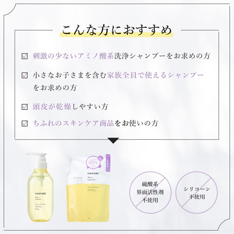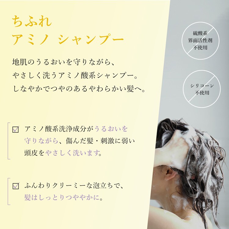 ・洗髪後は「ちふれ アミノ トリートメント コンディショナー」をお使いいただくことをおすすめします。