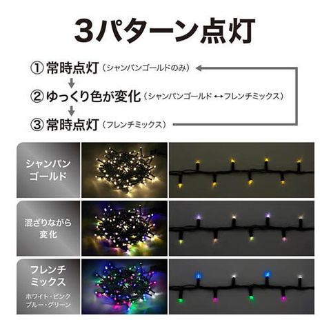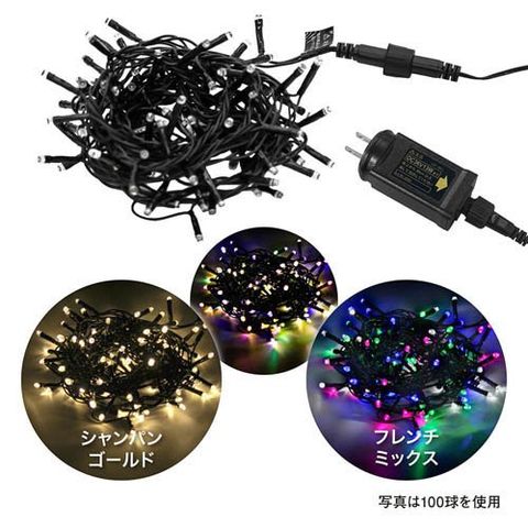 | 使用環境:屋外・屋内 LED部:約10m LED色:シャンパンゴールドandフレンチミックス(ホワイト・ピンク・ブルー・グリーン) LED数:200球 電圧36V・消費電力:3.9W 複数連結不可 コード色:ブラック 全長:約12.2m 材質:塩化ビニル樹脂 |