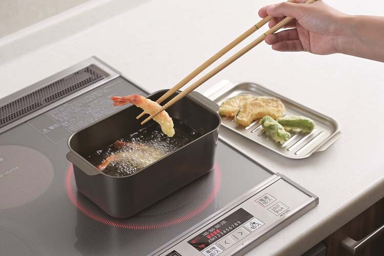丸鍋では揚げにくい、エビやアスパラなど長さのある食材も揚げやすい長角型