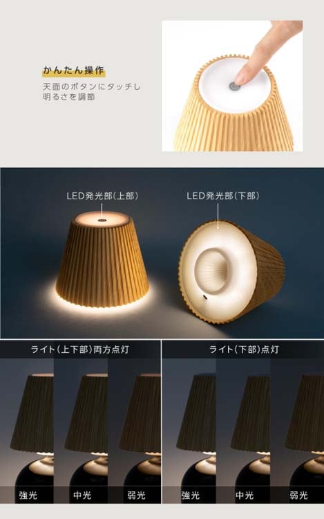 | ・本体サイズ(幅×奥行き×最大高さ):約130×130×106mm ・本体重量:約300g ・充電池種類:リチウムイオン充電池 ・充電池容量:DC3.7V 2200mAh ・本体定格入力電圧:DC5V 1A ・調光機能:3段階 ・光束(ルーメン):強光:120~150lm ・電源コード:約1.2m ・連続最大使用時間(満充電時) ・ライト(上下部)両方点灯時:強光 約4時間 中光 約8時間 弱光 約16時間 ・ライト(下部)点灯時:強光 約4.5時間 中光 約9時間 弱光 約17時間 ・充電時間:約4時間 |