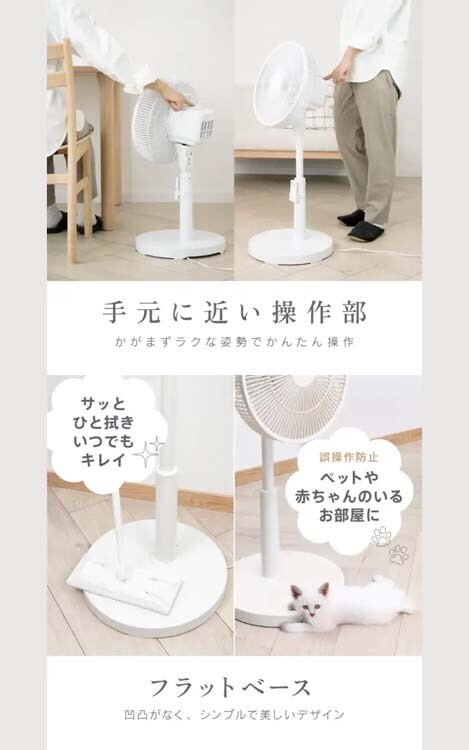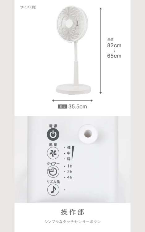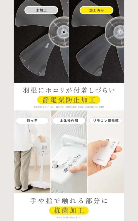 | 製品寸法:W355×D355×H820mm 製品質量:2.8kg 定格電圧:AC100V 定格周波数:50/60Hz 定格消費電力:36W/37W 電源コード長さ:1.6m ★抗菌効果 (1)取っ手・本体操作部(モーター後カバー):「抗菌の方法」樹脂に練り込み「試験方法」ISO 22196-2011に基づく「試験機関」Guangzhou Institute of Microbiology Group Co.、Ltd. (2)リモコン操作部:「抗菌の方法」シート表面にコーティング「試験方法」ISO 22196-2011に基づく「試験機関」SGS CSTC Standards Technical Services Co.、 Ltd. ★静電気防止効果 加工箇所:羽根 ※社内試験基準による |