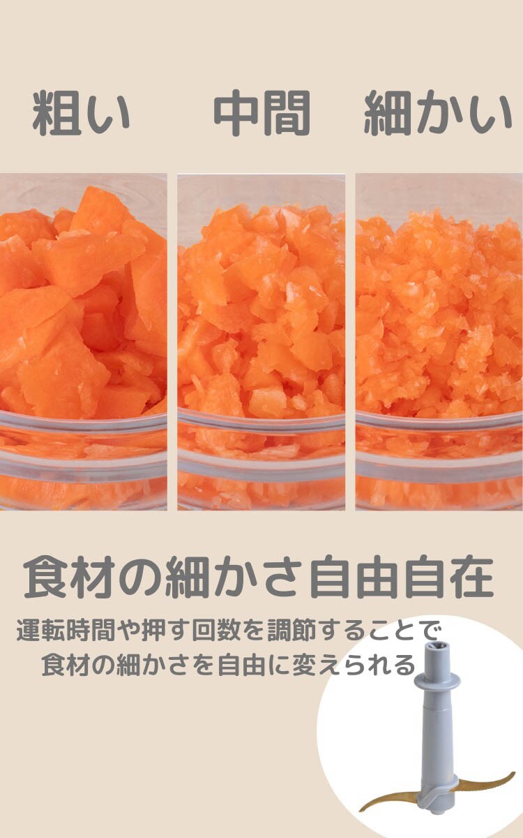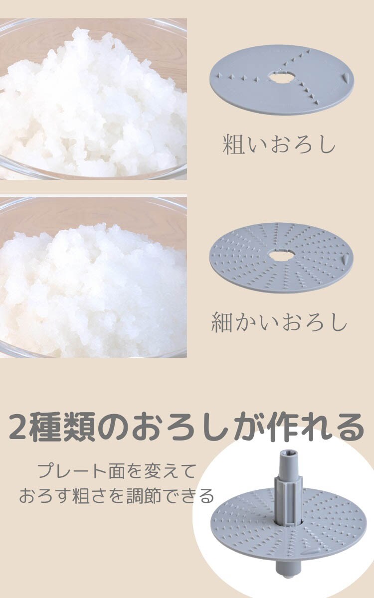 | サイズ:幅184×奥行158×高さ252mm 重量:約1.6kg(付属品を除く) 定格電圧:AC100V 定格周波数:50/60Hz 定格消費電力:200W 定格時間:1分 回転数(無負荷時):約3800回転/分 電源コード長:約0.8m 材質:ボール ガラス、ブレード ステンレス(チタンコート) アタッチメント:みじん切りブレード/両面おろしブレード |