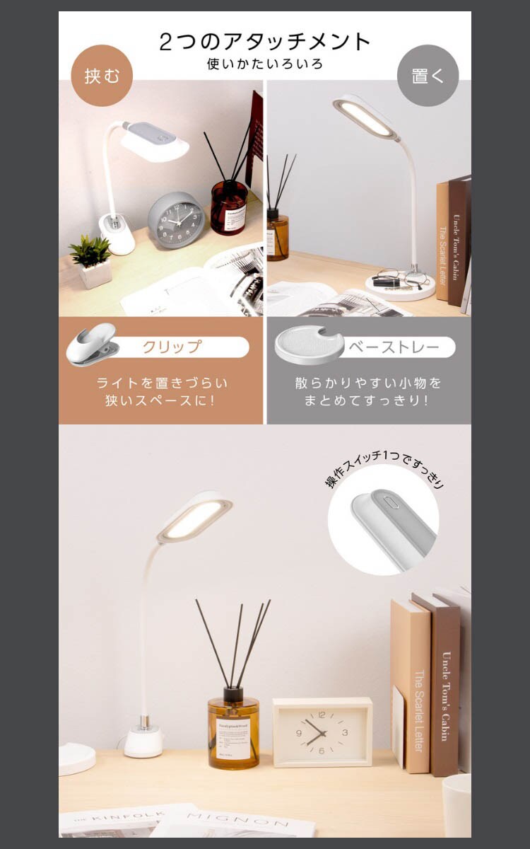 | サイズ:縦154×横158×高さ564(mm) 重量:450g(アタッチメント含まず) 消費電力:12W 色温度調整(K):昼白色 4600~5200K、電球色 2400~3000K、温白色3700~4000K 光束(Lm):昼白色 300lm、電球色 200lm、温白色 500lm アーム角度:フレキシブルアーム コード長:約1.5m その他機能:スタンド使い・クリップ使い 2way仕様 |