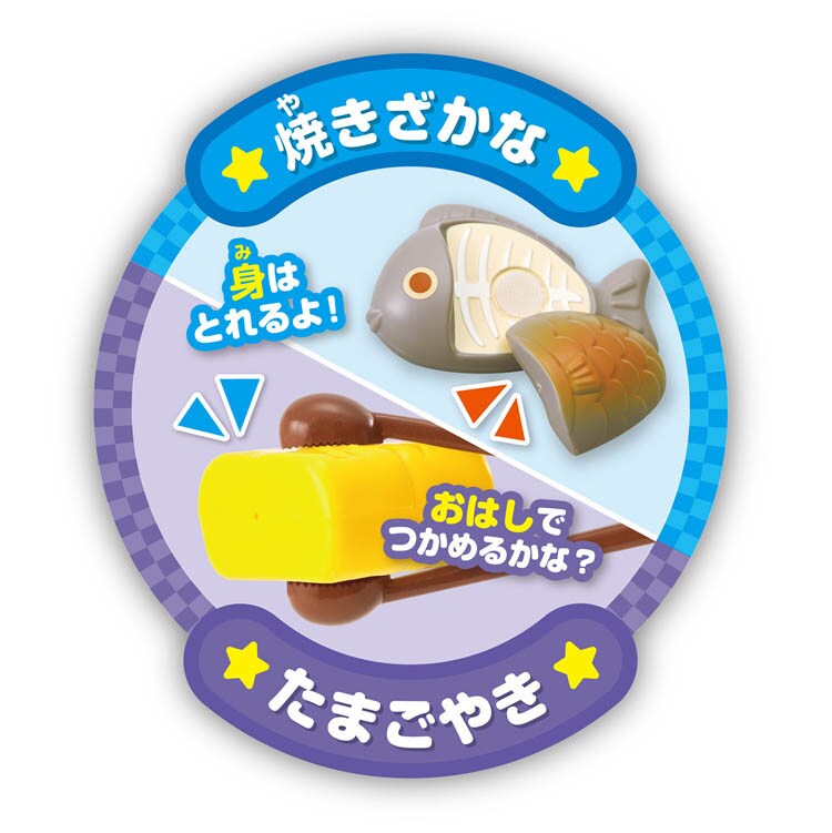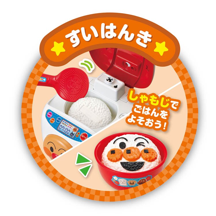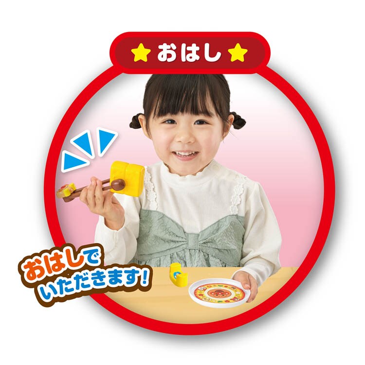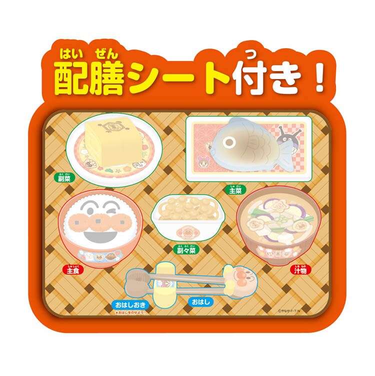 | すいはんき、立つしゃもじ、おはし、おはしおき、ちゃわん、おわん、おみそしるプレート、こばち、丸いお皿、四角いお皿、アンパンマンごはん、なっとう2こ、焼きざかなトントン、たまごやき、 ドキンちゃんふりかけ、スポイト、配膳シート(紙製)、シール(紙製) |