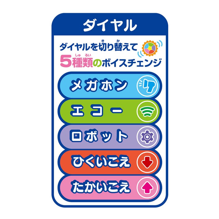 ●ダイヤルを回して切り替えると、メガホン、エコー、ロボット、低い声、高い声の5種類のボイズチェンジが楽しめます。