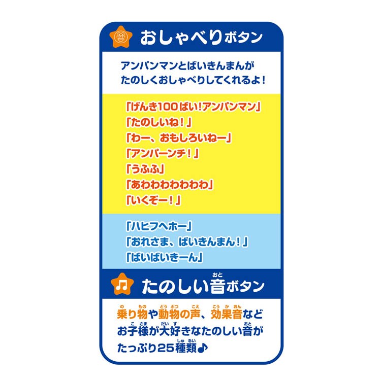 ●「おしゃべりボタン」を押すとアンパンマンとばいきんまんのおしゃべり、「たのしい音ボタン」を押すと乗り物や動物の声、効果音など楽しい音がたっぷり25種類!