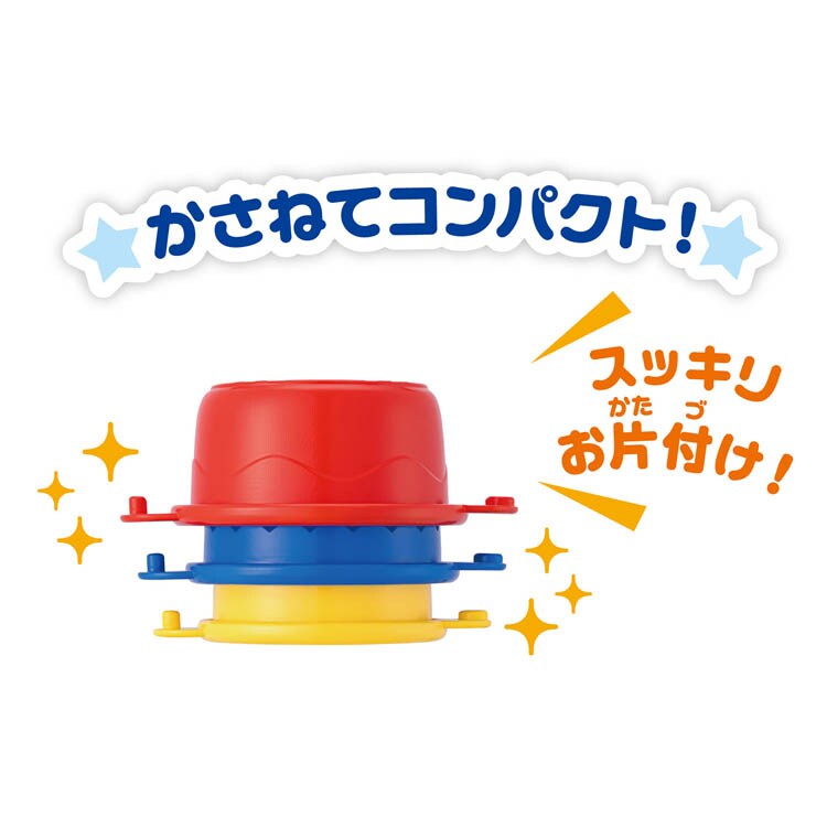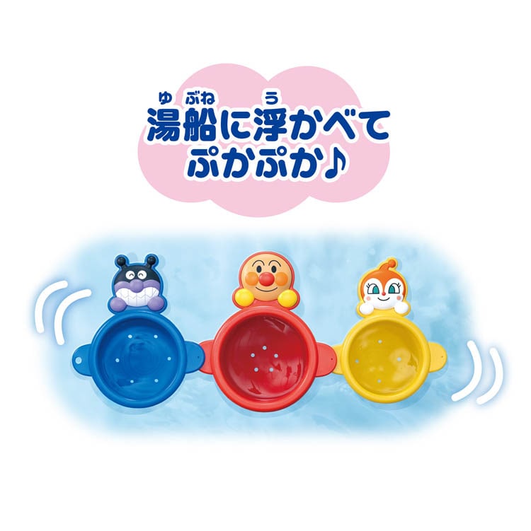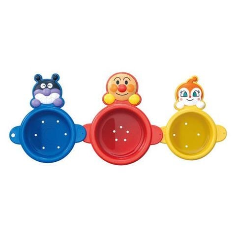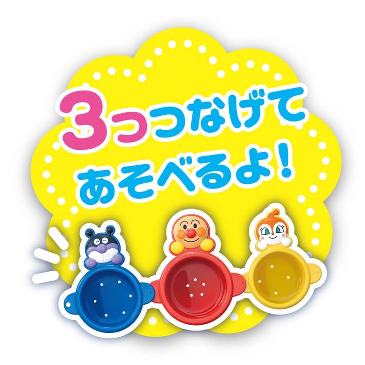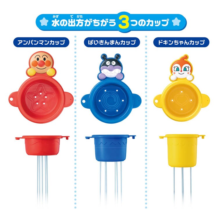 ●アンパンマン、ばいきんまん、ドキンちゃんの3つのカップはそれぞれ底面に穴が空いていて、お水を入れるとシャワー遊びが楽しめます。