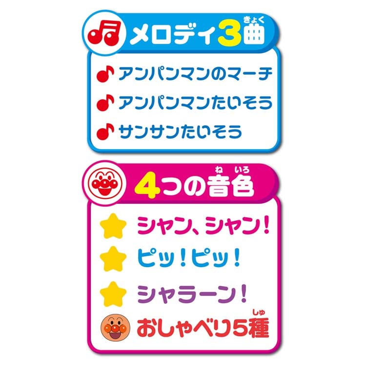 ●アンパンマンのメロディ3曲に楽しい楽器音とおしゃべりはそのままに、ライトは10色にパワーアップ!(シリーズ従来品比)
