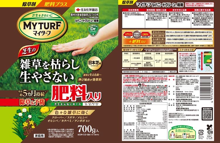 ●芝生にやさしく、芝生の中に生えた雑草を根まで枯らし、肥料が芝生を健やかに育てます。