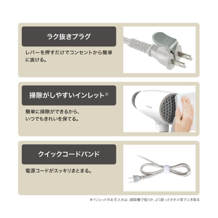 ●掃除のしやすいインレット※:簡単に掃除ができて、いつでもキレイで清潔に。※インレットのお手入れは、掃除機で吸うか、よく絞ったタオル等で拭き取ってください。