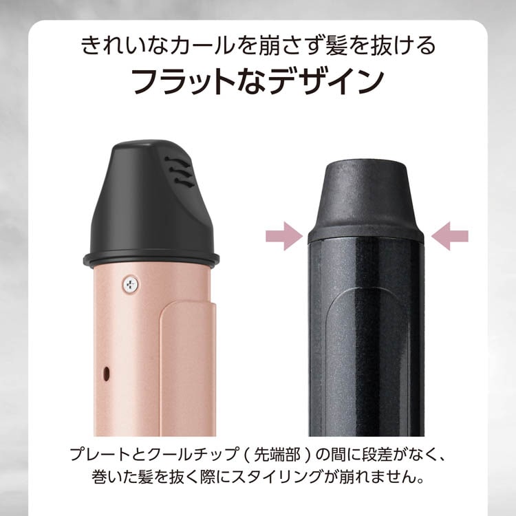 ●巻いた髪が引っかからないフラットデザイン。プレートとクールチップ(先端部)の間に段差がなく、巻いた髪を抜く際にスタイリングが崩れません。