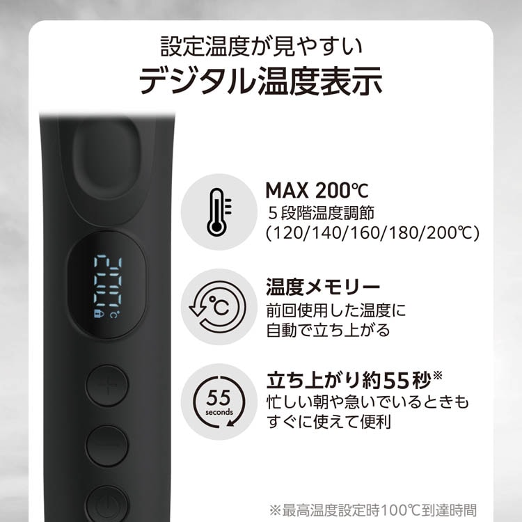 ●電源を入れてから約55秒(※)で使用可能な温度に到達。スピーディーな立ち上がりで、時間のない朝でも焦らずにスタイリングできます。 ※最高温度設定時100度到達時間