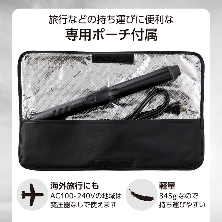 | ・電源方式:AC式 ・電源:AC100-240V 50/60Hz ・消費電力:62-65W ・アイロン径:32mm ・温度調節幅:120-200度(5段階 20度刻み) ・立ち上がり時間:約55秒(最高温度設定時100度到達時間) ・コーティング:ナノセラミックコーティング ・スイッチ:電源スイッチ「ON / OFF」、温度切替スイッチ「+ / -」 ・外形寸法:幅約323mm×奥行約38mm×高さ約67mm(本体のみ) ・質量:約345g(電源コード含む) ・主材料:PET、アルミニウム ・カラー:ブラック ・コード長:1.7m ・温度ロック機能:◯ ・温度メモリー機能:◯ ・自動電源OFF機能:◯(約30分後) ・ラク抜きプラグ:× ・海外使用:◯ ・付属品:専用ポーチ(耐熱温度140度) ・パーツ:専用ポーチ(TA033697) ・保証期間:1年間 |