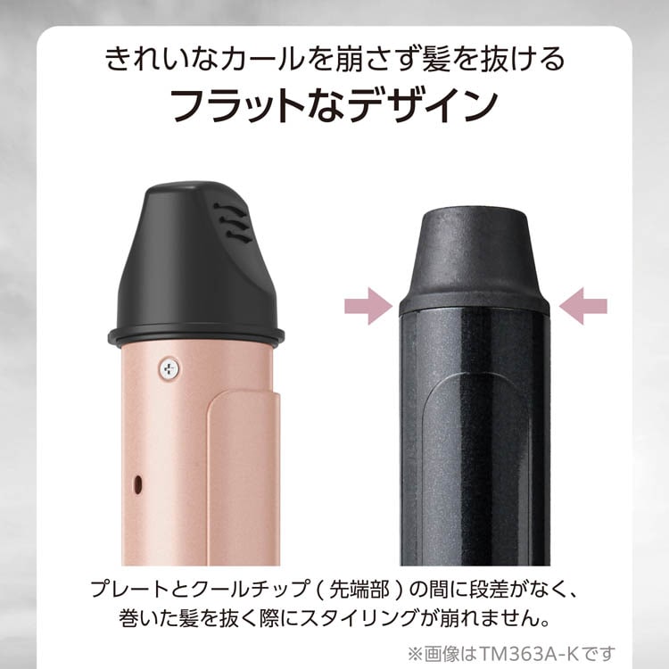 ●巻いた髪が引っかからないフラットデザイン。プレートとクールチップ(先端部)の間に段差がなく、巻いた髪を抜く際にスタイリングが崩れません。