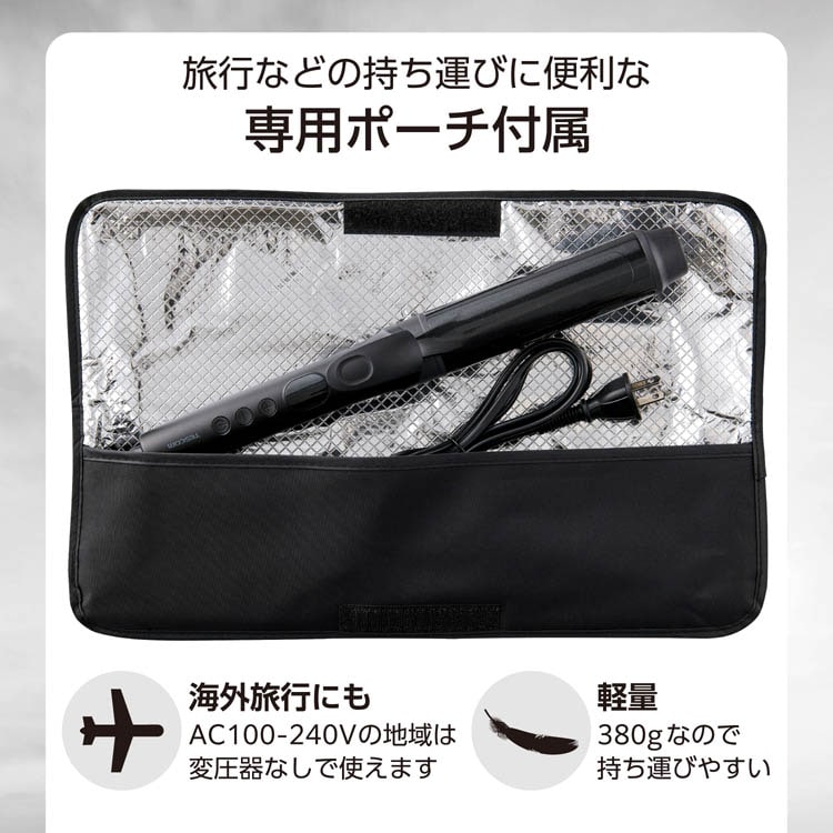 | ・電源方式:AC式 ・電源:AC100-240V 50/60Hz ・消費電力:75-78W ・アイロン径:38mm ・温度調節幅:120-200度(5段階 20度刻み) ・立ち上がり時間:約70秒(最高温度設定時100度到達時間) ・コーティング:ナノセラミックコーティング ・スイッチ:電源スイッチ「ON / OFF」、温度切替スイッチ「+ / -」 ・外形寸法:幅約323mm×奥行約38mm×高さ約67mm(本体のみ) ・質量:約380g(電源コード含む) ・主材料:PET、アルミニウム ・カラー:ブラック ・コード長:1.7m ・温度ロック機能:◯ ・温度メモリー機能:◯ ・自動電源OFF機能:◯(約30分後) ・ラク抜きプラグ:× ・海外使用:◯ ・付属品:専用ポーチ(耐熱温度140度) ・パーツ:専用ポーチ(TA033697) ・保証期間:1年間 |