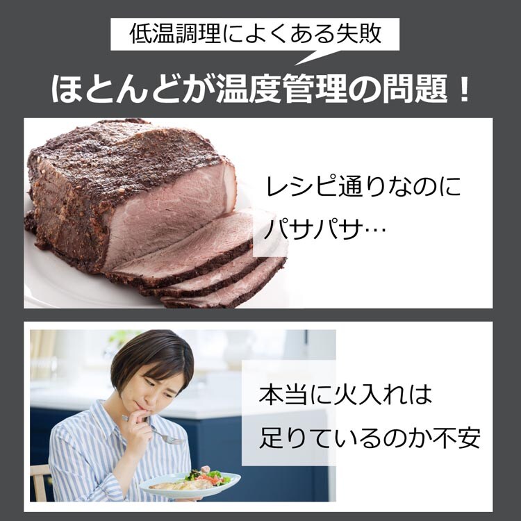 ●食材に刺した芯温温度計で食材の中心温度を測定。設定した中心温度に到達後、その温度を維持しながら調理します。 しっとりやわらかいサラダチキン、チャーシュー、ローストビーフなどが、ほったらかしで簡単においしく作れます。 ※2022年3月時点で発売されている民生用低温調理器カテゴリーにおいて(メーカー調べ)