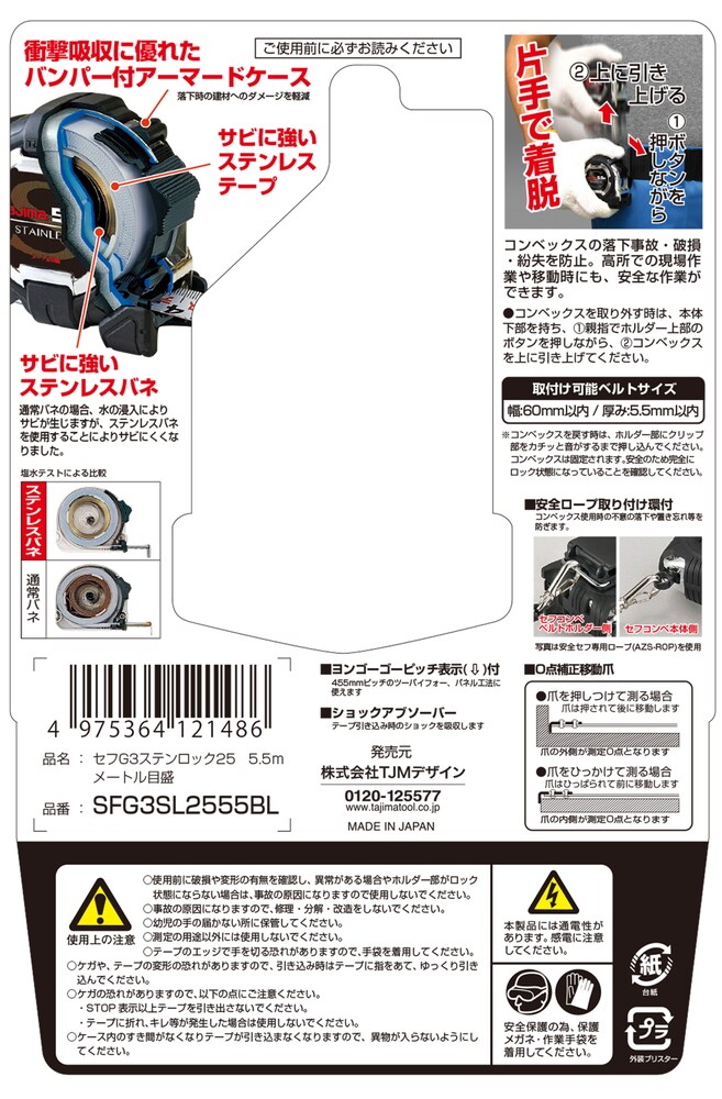 | ・目盛メートル目盛、JIS1級、両面目盛 ・テープ幅:25mm ・テープ長さ:5.5m ・テープ:白テープ ・ヨンゴーゴーピッチ表示付 ・ショックアブソーバー付 ・安全ロープ取付環付 ・爪飛び防止用プロテクター付 ・材質:テープ:SUS420J2、バネ:SUS301、ケース:ABS樹脂、カバー:エラストマー樹脂 |