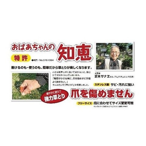 爪を傷めず小さな雑草を摘まんで抜き取れます。2cm未満の小さな雑草とりに便利です。リングは指に合うよう調整できます。根をおこす1山型で、単純な根に適しています。サビや汚れに強いステンレス製です。
