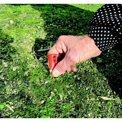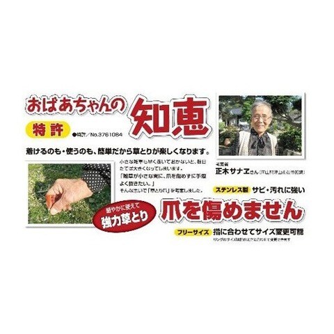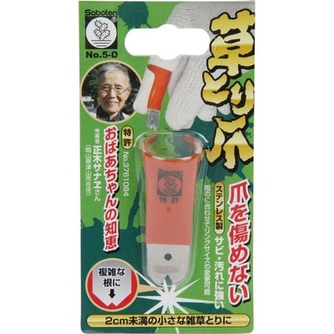 爪を傷めず小さな雑草を摘まんで抜き取れます。2cm未満の小さな雑草とりに便利です。リングは指に合うよう調整できます。根の間に差し込む2山型で、複雑な根に適しています。サビや汚れに強いステンレス製です。