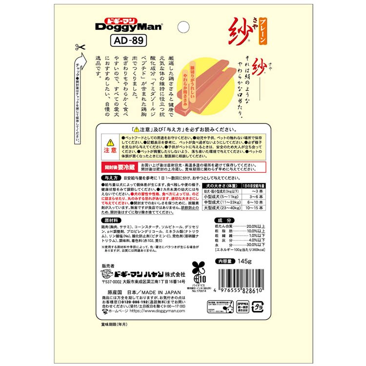 | 鶏肉(胸肉、ササミ)、コーンスターチ、ソルビトール、グリセリン、pH調整剤、プロピレングリコール、ミネラル類(ナトリウム)、リン酸塩(Na)、酸化防止剤(ビタミンC)、発色剤(亜硝酸ナトリウム)、調味料、着色料(赤102、黄5) |
