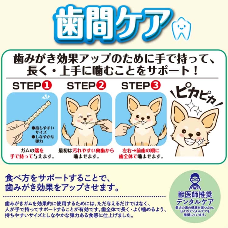 ●オーナーさんが持って噛み噛みをサポートしやすいサイズとしなやかな弾力ある食感。