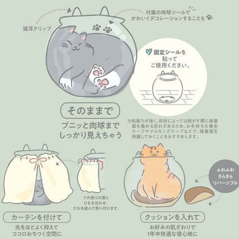 | 材質、成分:本体:PET、クッション:ポリエステル、カーテン:ポリエステル、肉球シール:紙、固定シール:アクリル樹脂、猫耳クリップ:ポリプロピレン |