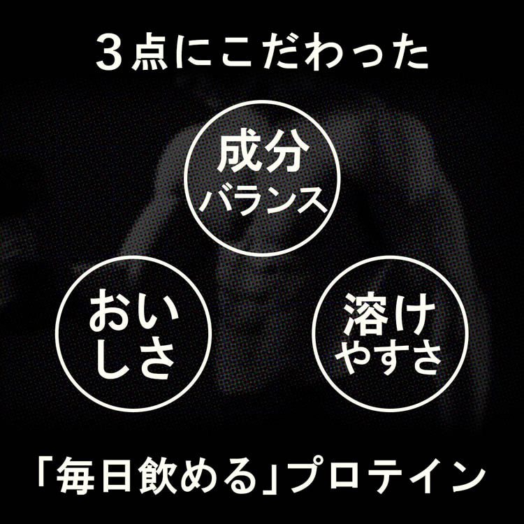 ●吸収率の高いホエイプロテインをメインに、カラダのベースを整える「7種のビタミンB群」と「ビタミンC」を配合