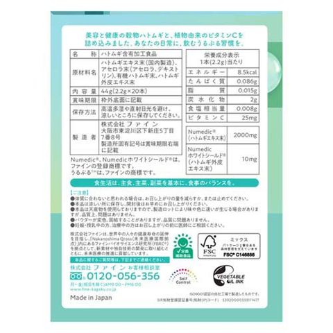 | 1本(2.2g)あたり エネルギー:8.5kcal、たんぱく質:0.086g、脂質:0.015g、炭水化物:2g、食塩相当量:0.008g、ビタミンC:25mg Numedic(R)(ハトムギエキス末):2000mg、Numedicホワイトシールド(R)(ハトムギ外皮エキス末):10mg |