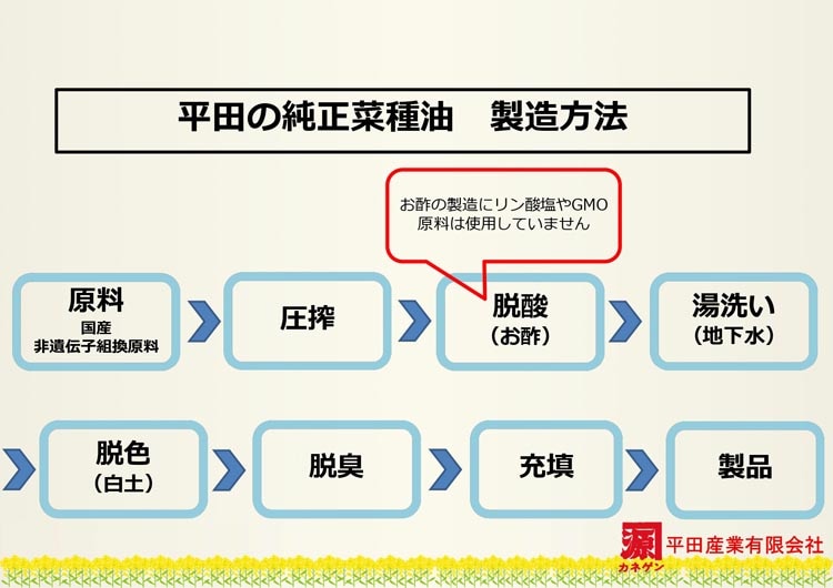 ●圧搾により搾り出した一番搾りの油だけを、食酢とお湯により精製した菜種油です。