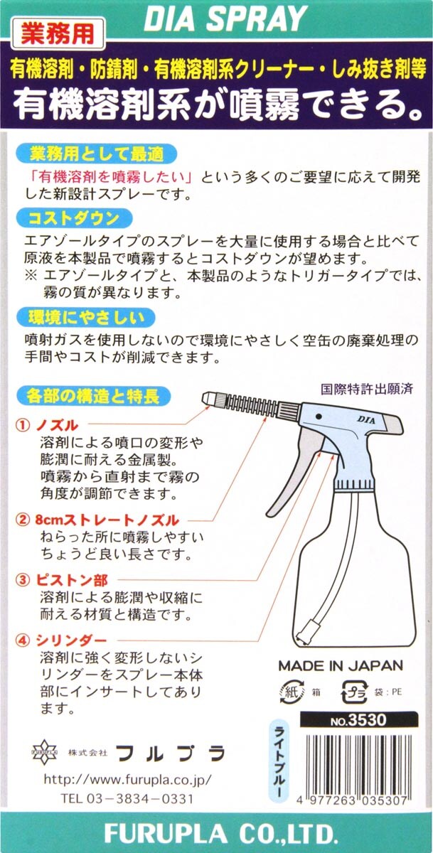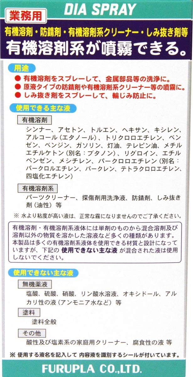 | <使用できる主な液> ・有機溶剤:ベンゼン・ベンジン・ヘキサン・テレピン油・シンナー・トルエン・クレゾール・アセトン・ブタノン等 ・洗浄液:灯油・ガソリン・有機溶剤系クリーナー等 ・防錆剤:一般に市販されている防錆剤 ・しみぬき剤:油性用 油剤及び乳剤系殺虫剤の原液 |