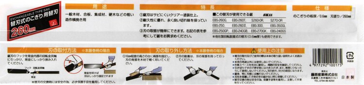 | ・刃渡り:260mm、のこぎりの板厚:0.6mm ・適合機種(この替刃が使用できる鋸):SK11替刃式鋸(EBS-260G、EBS-260T、EBS-250、EBS-260II、EBS-300、EBS-350GL、EBS-250GP、EBS-240GB、EBS-270GK、EBS-240GS、S-260-OR、S-270-OR) ※他メーカー製回転着脱式の替刃(0.6mm厚)も使用できます |
