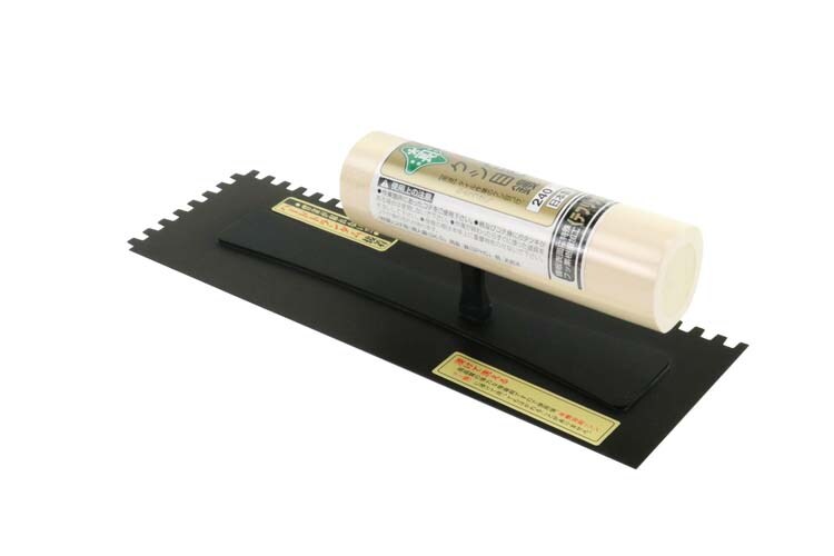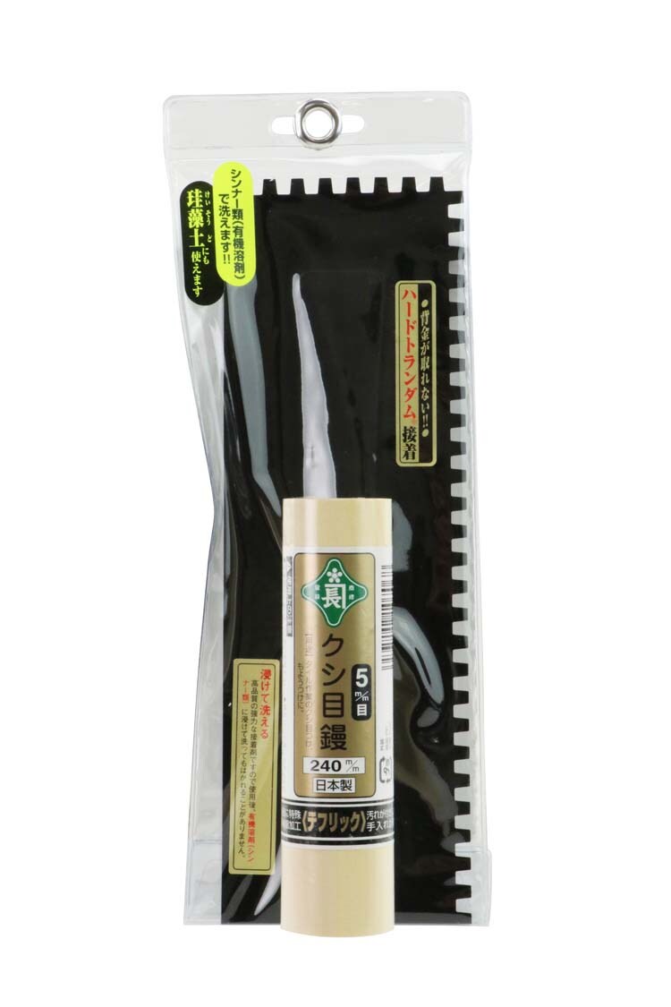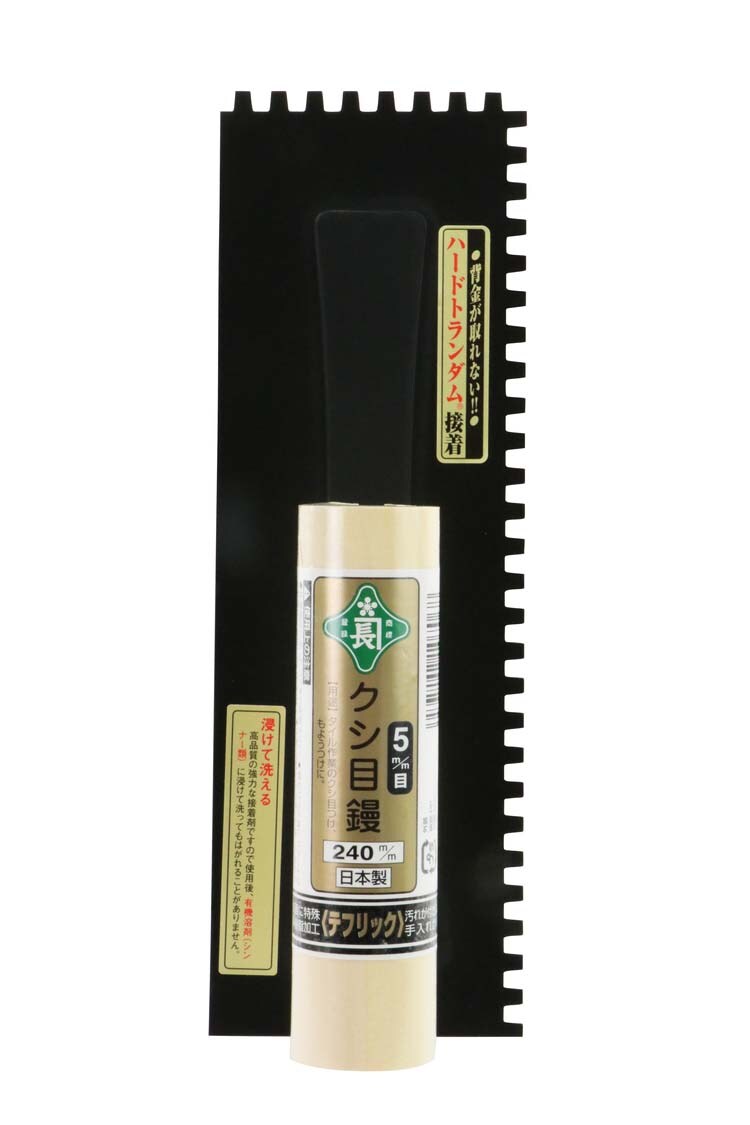 | クシ目サイズ:5mm 鏝サイズ:240mm 背金式ハードトランダム接着 フッ素加工 材質:鏝板:焼入鋼 柄首:SPHC 柄:天然木 |